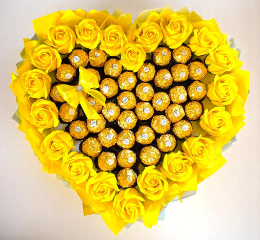 Herzförmiger Ferrero Rocher Schokoladenstrauß mit Gelben Rosen – Geschenkidee für Geburtstag, Jahrestag, Muttertag & Valentinstag