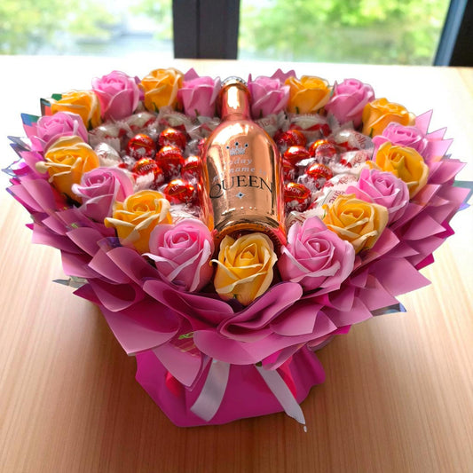 Essbarer Geschenkstrauß für Frauen – Raffaello, Lindor, Seifenrosen & Rosé-Flasche „Queen“ – Geburtstag, Valentinstag, Muttertag