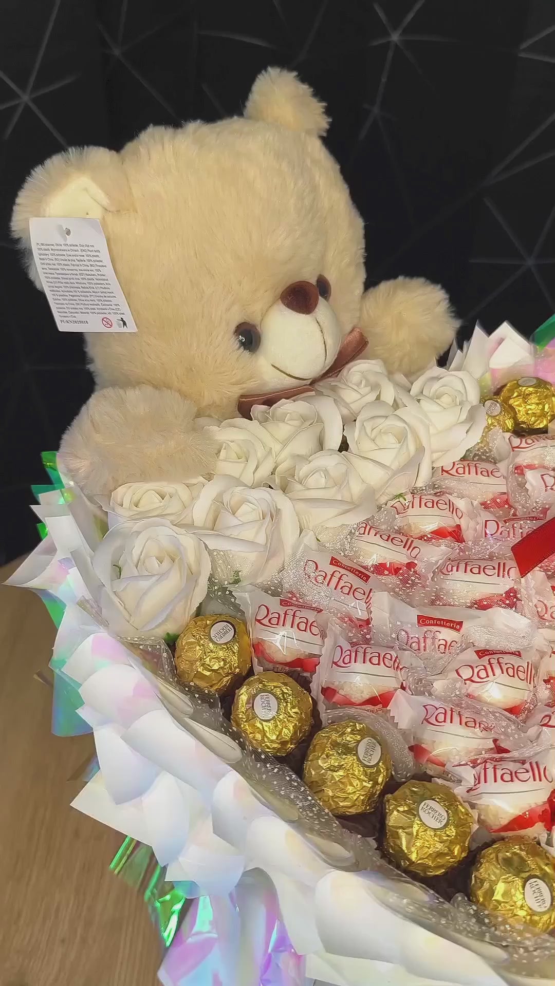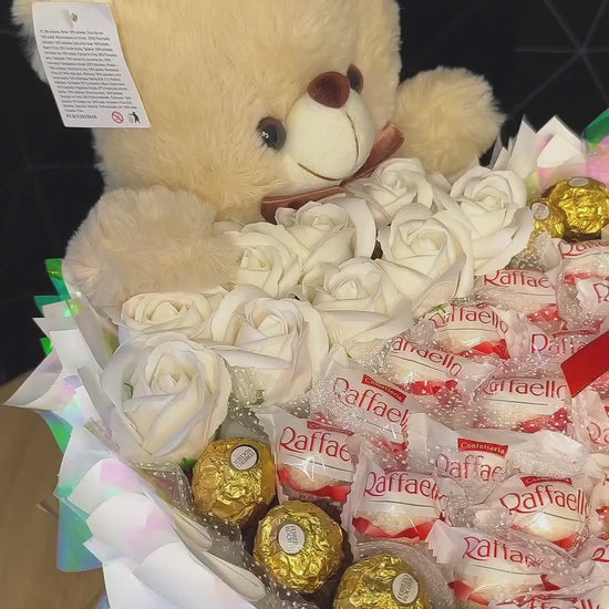 Dieser handgefertigte Pralinenstrauß mit Teddybär ist eine liebevolle und außergewöhnliche Geschenkidee, die Emotionen, Süße und Eleganz miteinander verbindet. Die herzförmige Komposition aus beliebten Raffaello- und Ferrero-Rocher-Pralinen wird durch einen kuscheligen Teddybären ergänzt und macht diesen Schokoladenstrauß zu einem unvergesslichen Präsent für besondere Momente.