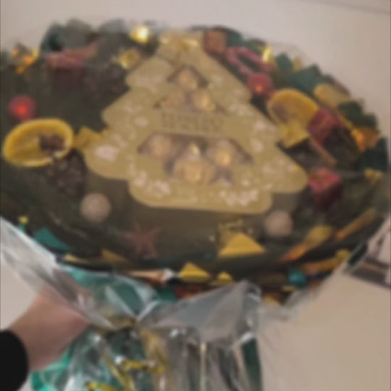 Christmas Ferrero Rocher delight : Our Christmas Ferrero Rocher bouquet combines luxurious enjoyment with festive elegance - an ideal gift idea for the most wonderful time of the year. The centerpiece of this magnificent bouquet is a golden Ferrero Rocher box in the shape of a Christmas tree, filled with the world-famous pralines. The fine hazelnut cream and the crunchy chocolate coating make each praline an incomparable taste experience. This sweet highlight is framed by fresh, fragrant fir branches that create an authentic Christmas atmosphere. Decorative cinnamon sticks and dried orange slices spread a pleasant, Christmassy scent and create an atmospheric backdrop. Shiny Christmas balls, small gift boxes and festive ornaments in red and gold give the bouquet a noble shine that makes every home shine. A red and white striped candy cane adds a playful touch and brings back memories of childhood. This edible bouquet is not only a visual highlight, but also an exquisite way to express your love and appreciation. Perfect as a luxurious gift for friends, family or business partners who want to enjoy the magic of Christmas to the fullest. Give your loved ones a festive treat that appeals to all the senses - with our Christmas Ferrero Rocher bouquet, which stylishly combines enjoyment and festive spirit. Ideal for Christmas parties, as a table decoration or as an exclusive gift that will be remembered.