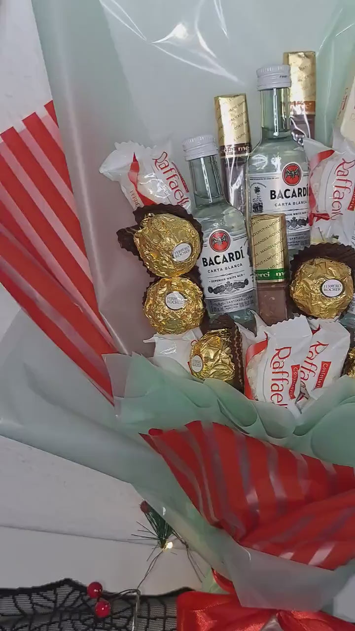 Hochwertige Produkte: Vom erlesenen Bacardi Rum bis zu den delikaten Raffaello und Ferrero Rocher Pralinen sowie den zarten Raffaello Schokoladentäfelchen – jede Komponente dieses Straußes steht für höchste Qualität und Genuss.