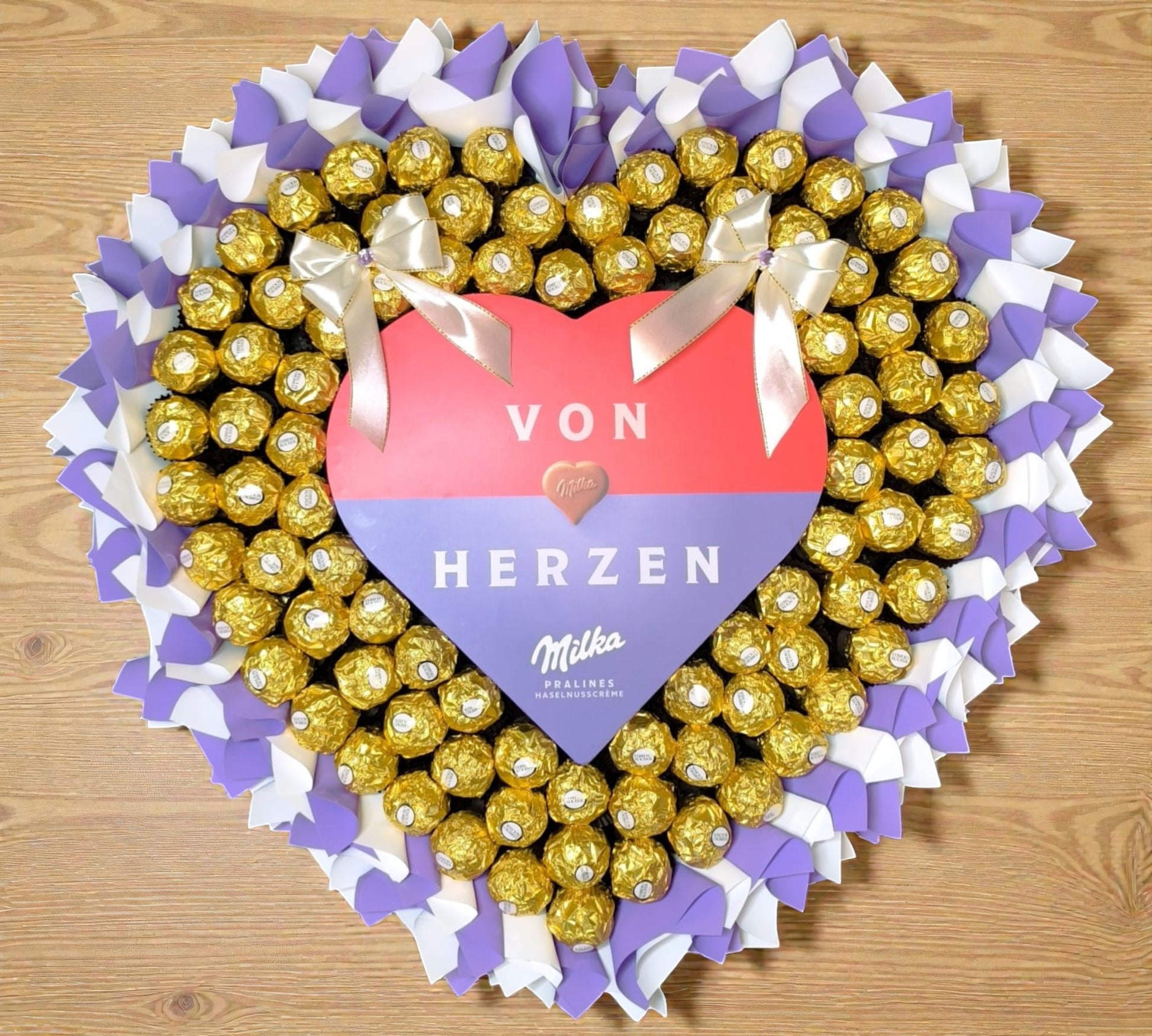 Ferrero Rocher Herz Strauss Deluxe XL mit Milka Pralinen – großer Schokoladenstrauss Herzform lila gold Geschenk