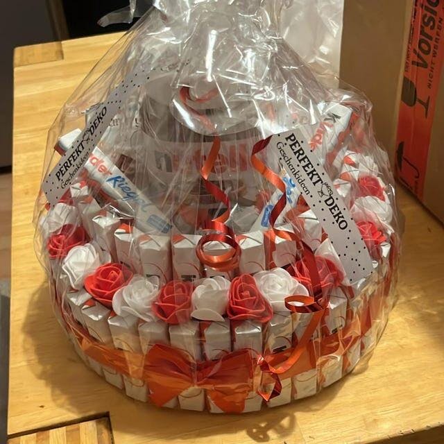 Machen Sie jeden Anlass unvergesslich mit diesem einzigartigen Nutella-Geschenkkuchen! Der Kuchen ist ein wahres Schokoladenparadies, verziert mit einer großen Nutella-Creme, umgeben von köstlichen Kinder-Süßigkeiten wie Kinder Riegel, Kinder Country und Schoko-Bons. Ergänzt durch stilvolle rote und weiße Rosen sowie eine elegante Schleife – ein perfektes Geschenk für Geburtstage, Jubiläen, Hochzeiten oder einfach zum Verwöhnen Ihrer Liebsten.