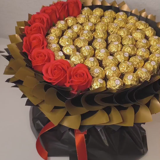 Die goldenen Ferrero Rocher Pralinen sorgen für ein unwiderstehliches Geschmackserlebnis, während die dekorativen Seifenrosen eine langlebige und duftende Alternative zu frischen Blumen darstellen. Verpackt in edlem schwarzem Geschenkpapier mit rotem Satinband, verleiht dieser Rosenstrauß mit Schokolade jeder Überraschung eine luxuriöse Note.