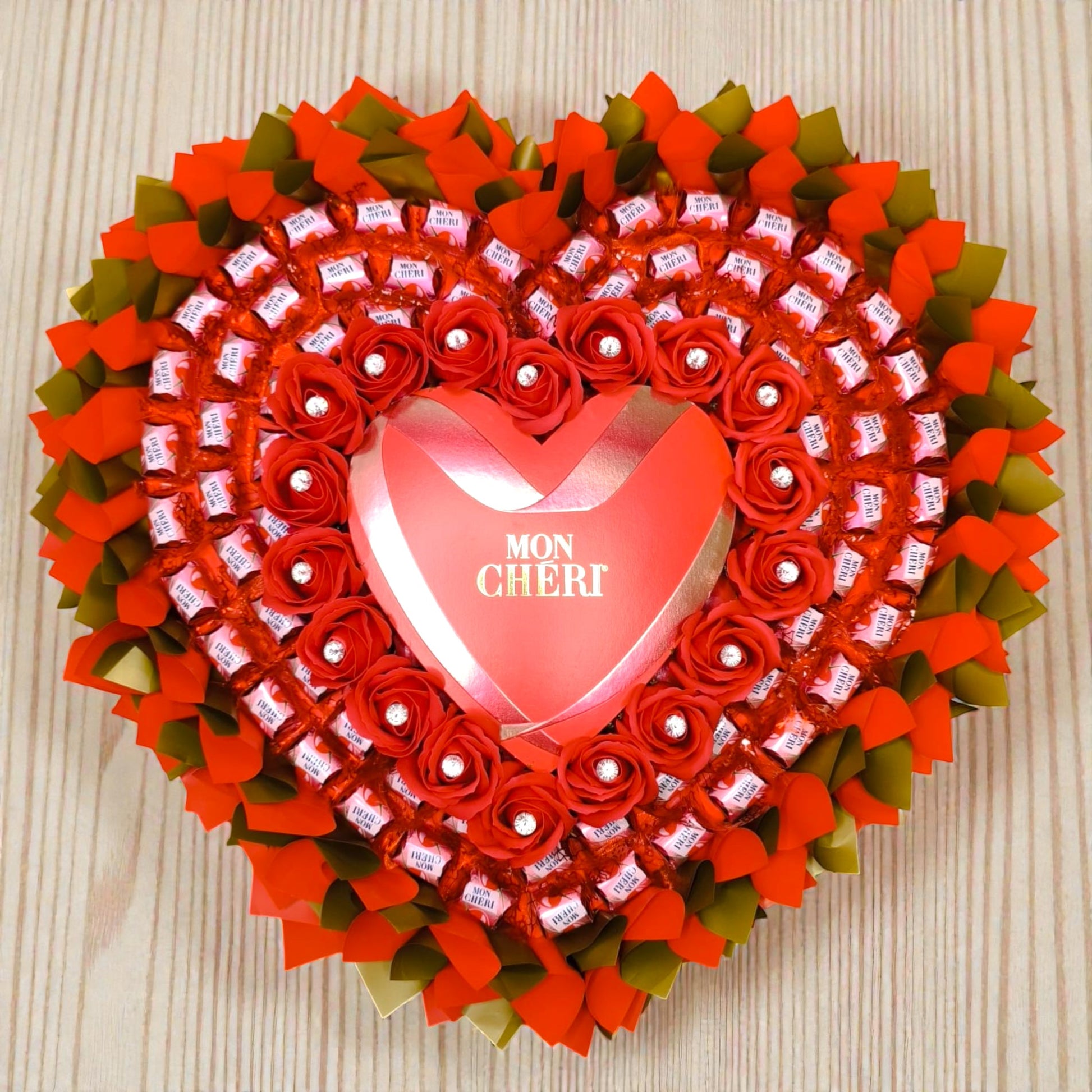 Mon Chéri Strauss XL Deluxe mit Seifenrosen – Essbarer Strauss mit Ferrero Mon Chéri Pralinen und Herzbox Geschenk