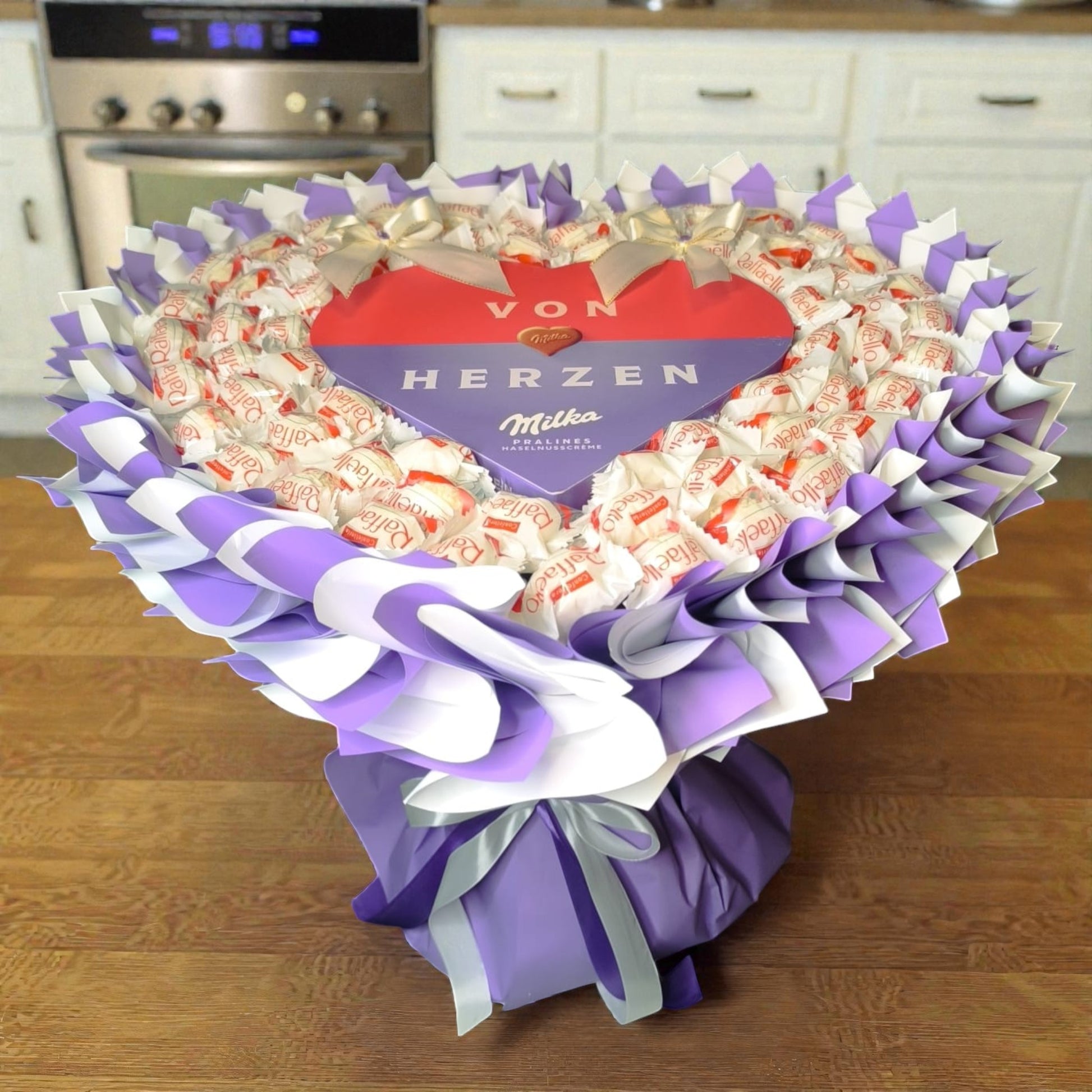 Raffaello Herz Strauss Deluxe XL mit Milka Pralinen – großer Süßigkeitenstrauss Herzform lila weiß Geschenk